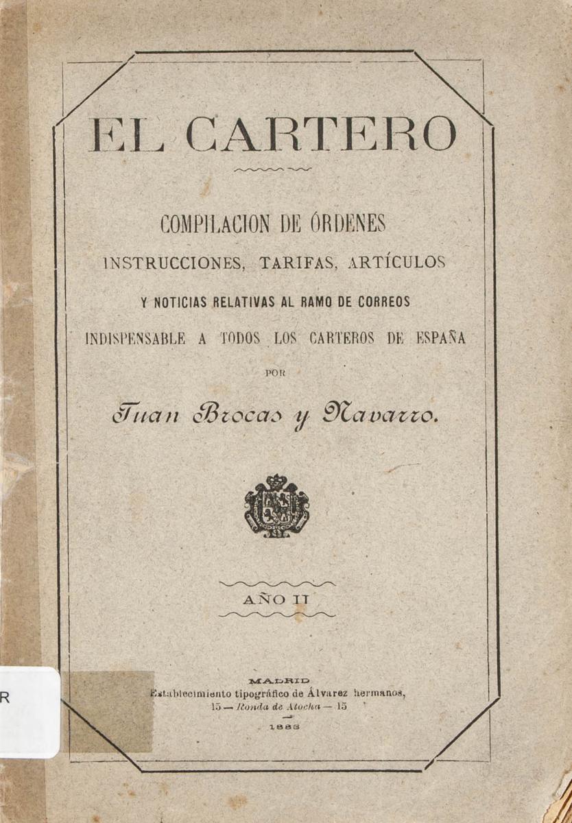 1883. EL CARTERO, COMPILACION DE ORDENES, INSTRUCCIONES, TARIFAS, ARTICULOS Y NOTICIAS RELATIVAS AL RAMO DE CORREOS INDISPENSABLE A TODOS LOS CARTEROS DE ESPAÑA (2ª edición). Juan Brocas y Navarro. Administración de Correos. Madrid, 1883.