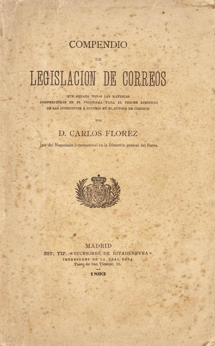 1893. COMPENDIO DE LEGISLACION DE CORREOS. Carlos Flórez. Dirección General de Correos. Madrid, 1893.