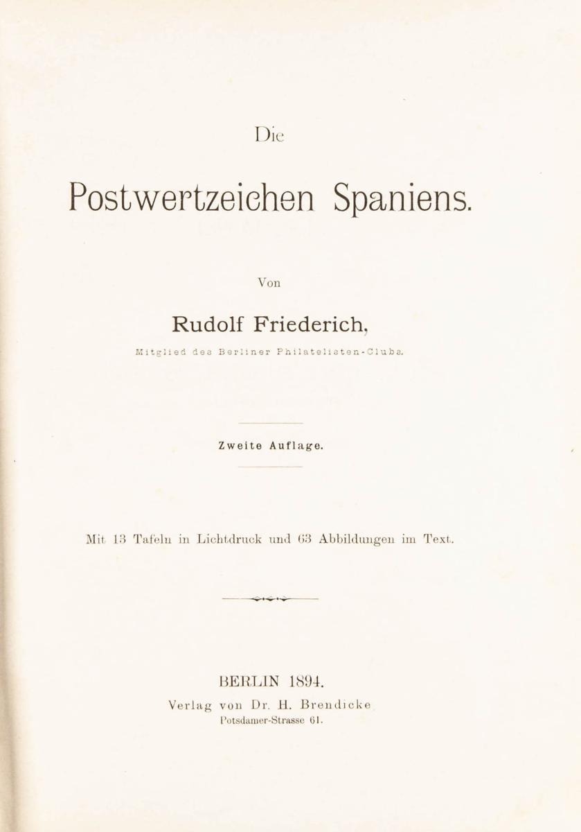 1894. DIE POSTWERTZEICHEN SPANIENS UND SEINER KOLONIEN. Rudolf Friederich. Berlinen Philatelisten-Clubs. Berlín, 1894.