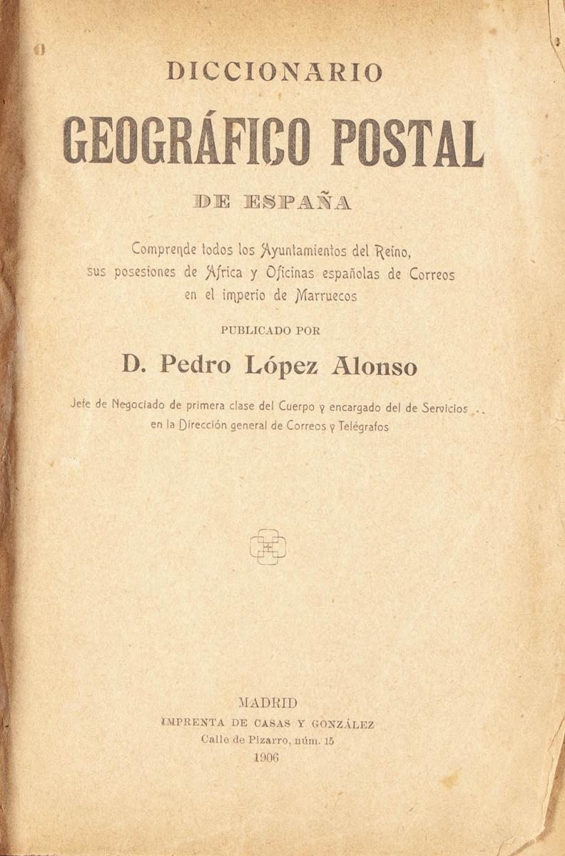 1906. DICCIONARIO GEOGRAFICO POSTAL DE ESPAÑA. Pedro López Alonso. Madrid, 1906. (ejemplar ligeramente fatigado)