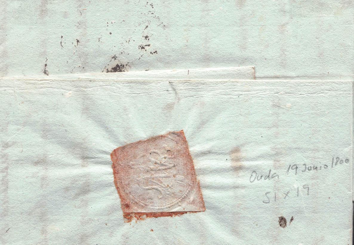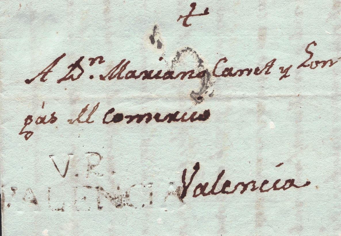 1800. ONDA (CASTELLON) a VALENCIA. Marca V.R. / VALENCIA, de Villarreal estampada en tránsito (P.E.2) edición 2004. MAGNIFICA Y RARISIMA.