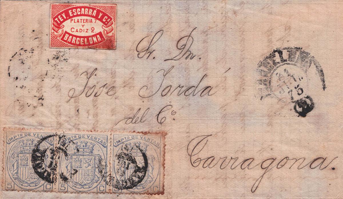 1875. 5 cts azul pálido IMPUESTO DE VENTAS, tira de tres. BARCELONA a TARRAGONA, en el frente viñeta comercial. BONITA Y RARISIMO USO POSTAL CON SELLOS FISCALES. (Alemany 1b)