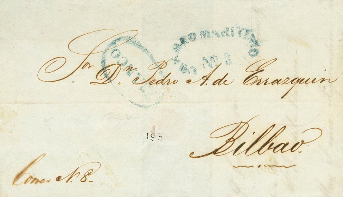 1848. LA HABANA a BILBAO. Marcas FRANCO (P.E.22) edición 2004 y CORREO MARITIMO / Nº8 (P.E.51), ambas en azul. MAGNIFICA Y RARA.