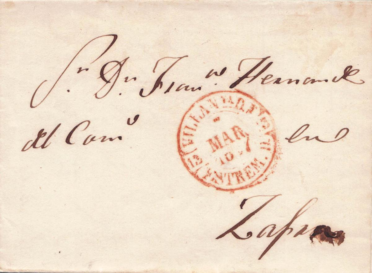 1847. VILLANUEVA DEL FRESNO (BADAJOZ) a ZAFRA. Baeza VILLANVª D.F. / ESTREM.B., en rojo. MAGNIFICA Y RARA.