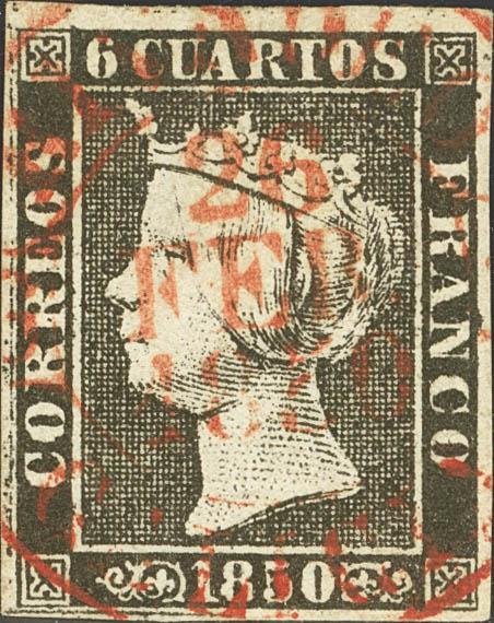 1. 1850. 6 cuartos negro. Matasello baeza RIVADEO / GALICIA. MAGNIFICO Y ESPECTACULAR.