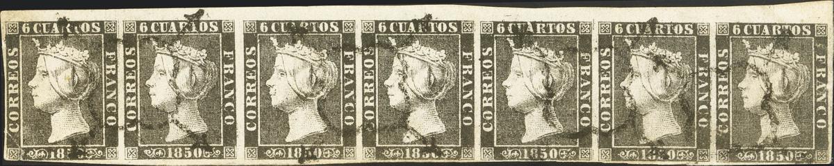 1A(7). 1850. 6 cuartos negro, tira de siete sellos con borde superior de pliego (Posiciones 7, 8, 1, 2, 3, 4, 5). MAGNIFICA Y MUY RARA, IDEAL PARA EL ESTUDIO DE LA COMPOSICION DE PLANCHA, EN ESTE CASO PLANCHA II TIPO C DE LA CLASIFICACION GUEZALA-ARCAUTE, Y SIN DUDA UNA PIEZA DE GRAN INTERES POR LA INFORMACION QUE ATESORA.