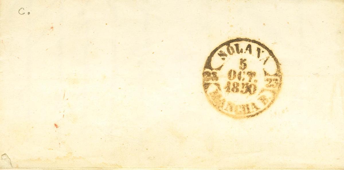 1A. 1850. 6 cuartos negro. ALMAGRO a SOLANA. En el frente baeza ALMAGRO / MANCHA B. MAGNIFICA Y RARA.