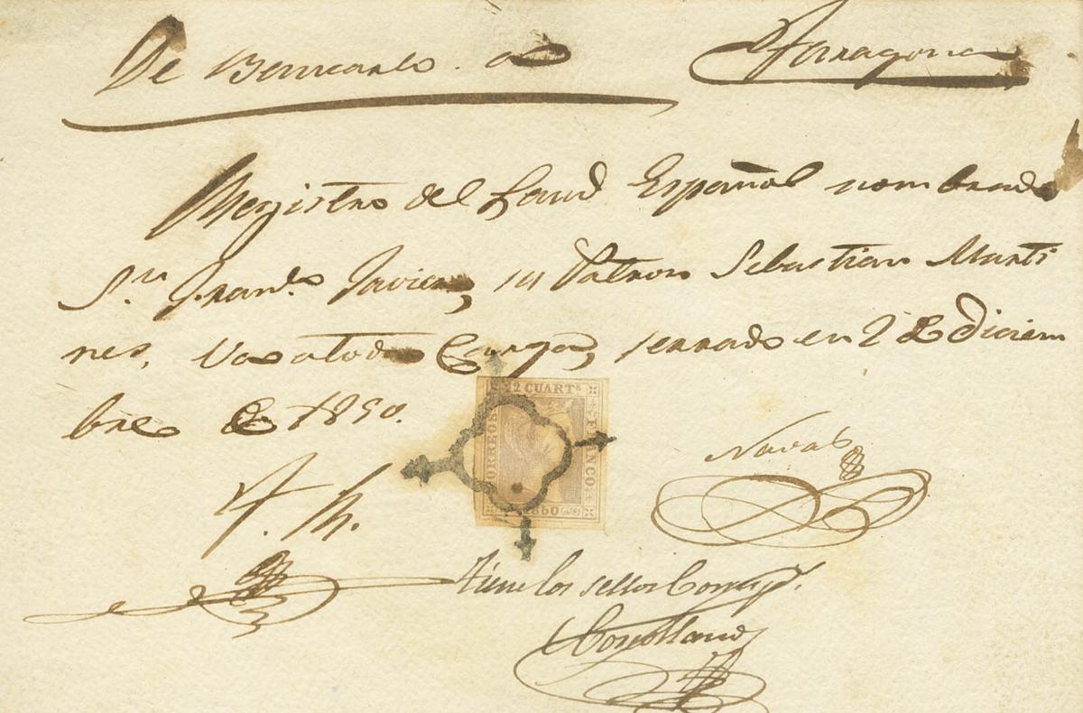 2. 1850. 12 cuartos lila. Frente de Registro de Embarque del "Laúd San Francisco Javier" de BENICARLO (CASTELLON) a TARRAGONA. Manuscrito "Tiene los sellos correspondientes". MAGNIFICO Y EXTRAORDINARIAMENTE RARO, SOLO SE CONOCEN TRES REGISTROS CIRCULADOS CON EL SELLO DE 12 CUARTOS EN LA PRIMERA EMISION.