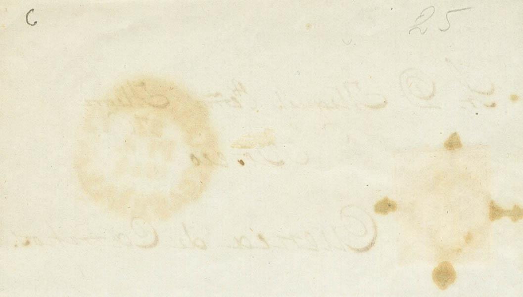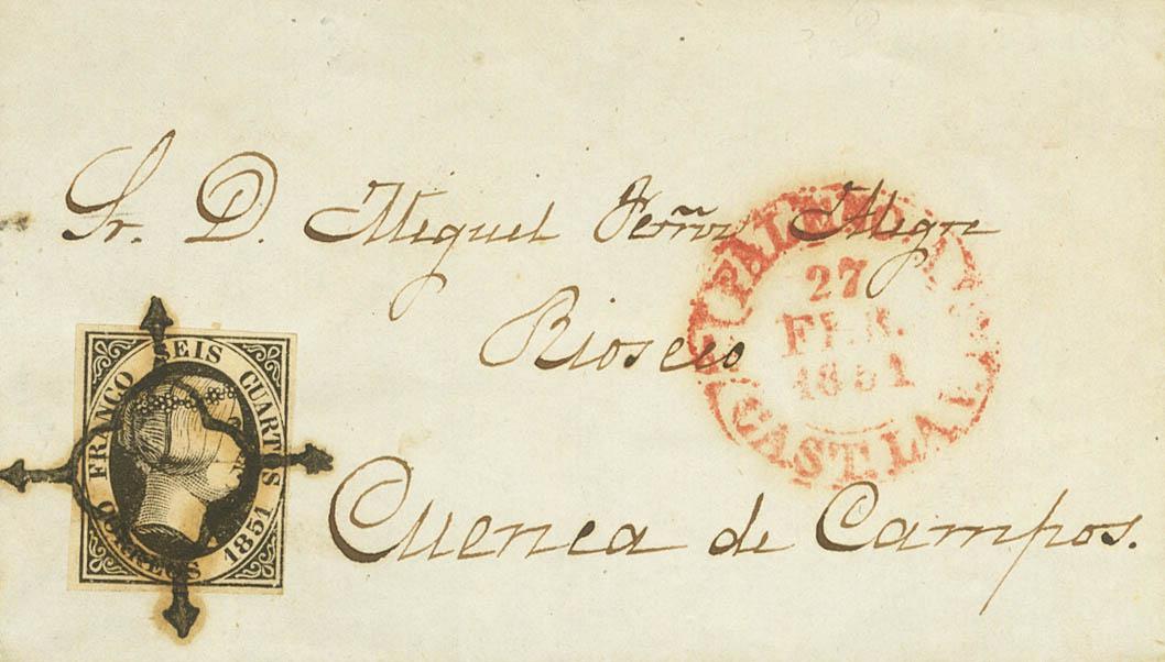 6. 1851. 6 cuartos negro. Frontal de PALENCIA a CUENCA DE CAMPOS. En el frente baeza PALENCIA / CAST.LA V. MAGNIFICA.