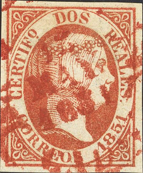 8F. 1851. 2 reales bermellón FALSO SPERATI (Tipo A), al dorso marca de la B.P.A. Matasello baeza. MAGNIFICO.