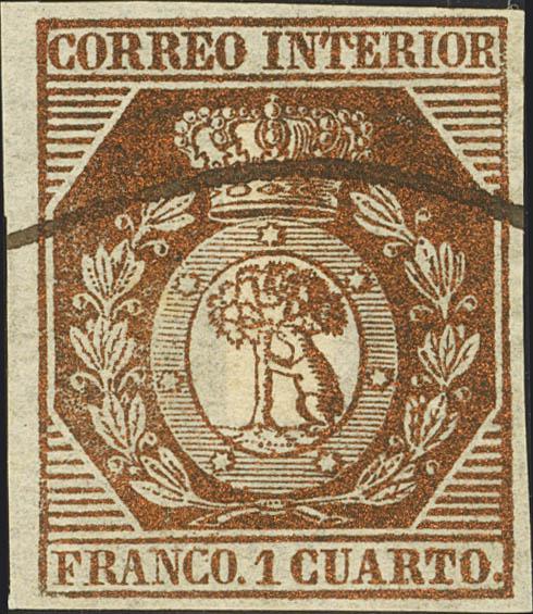 22Ma. 1853. 1 cuarto bronce dorado. Raya de tinta MUESTRA. MAGNIFICO. Edifil 2020: 475 Euros