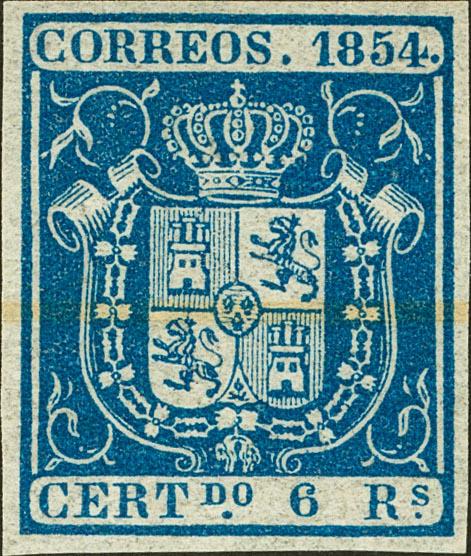 27M. 1854. 6 reales azul (raya de tinta horizontal). MUESTRA. MAGNIFICO Y ESPECTACULAR PRESENCIA. Edifil 2020: 600 Euros