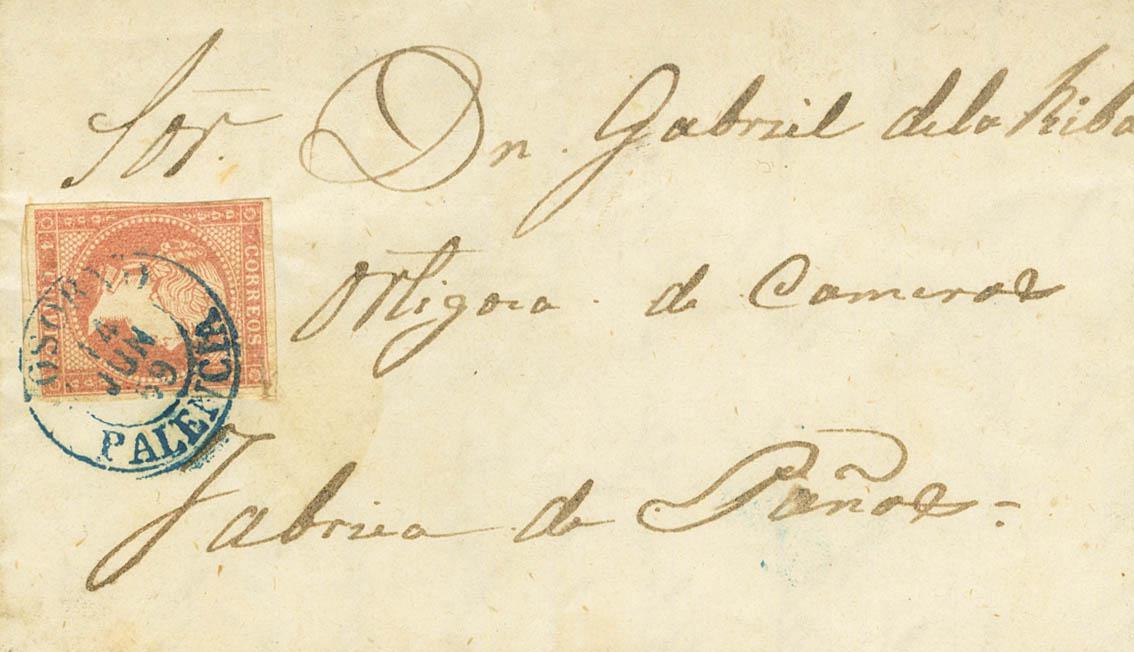 48. 1855. 4 cuartos rojo. VILLASARRACINO (PALENCIA) a ORTIGOSA DE CAMEROS (LOGROÑO). Matasello OSORNO / PALENCIA (Tipo I), en azul en tránsito. MAGNIFICA.