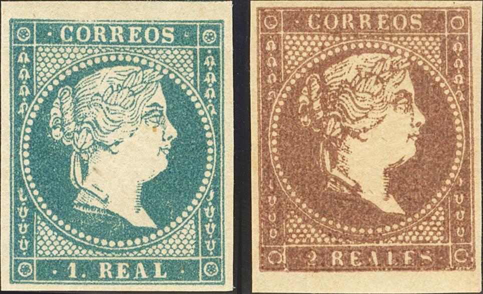 ★★ 49, 50. 1855. 1 real azul y 2 reales violeta. MAGNIFICOS.