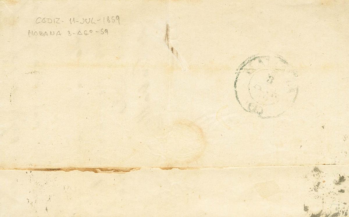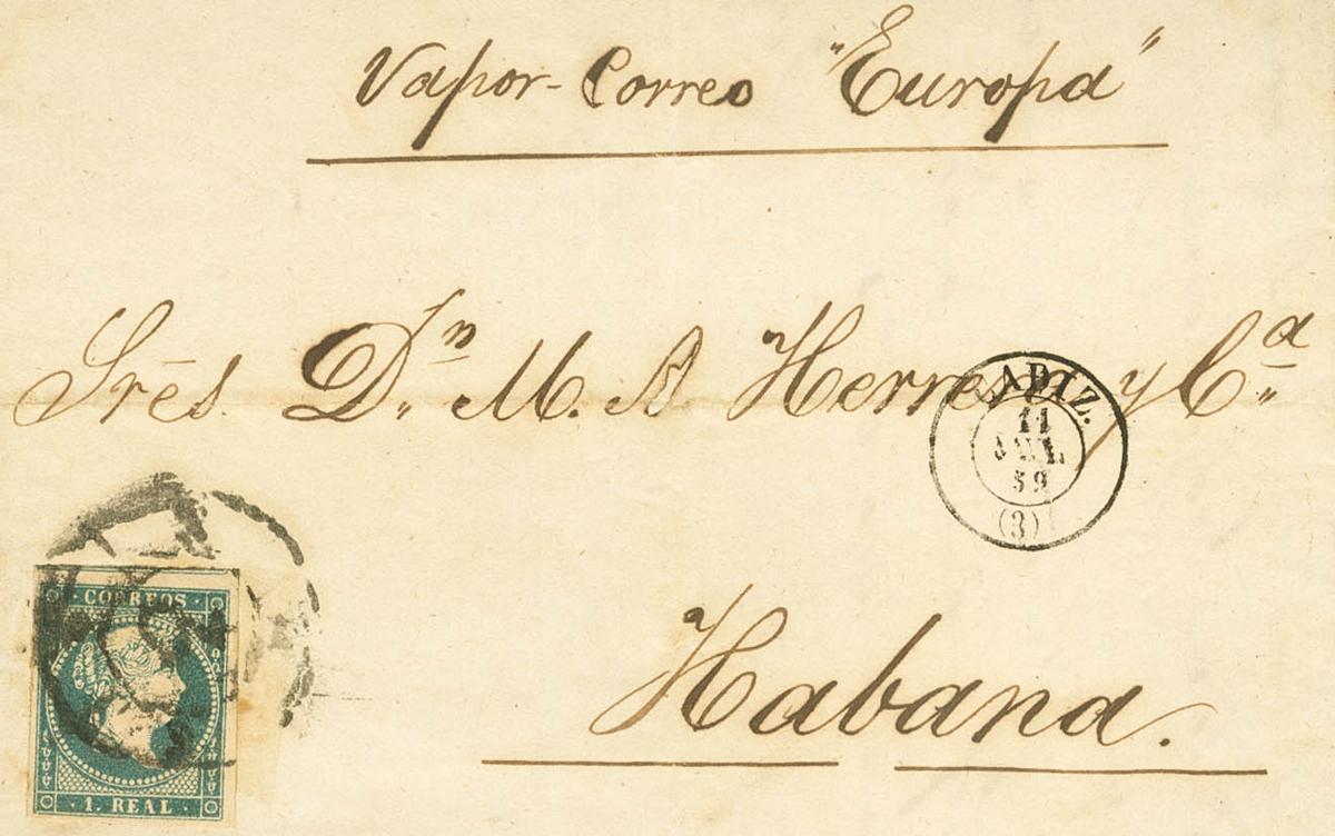 49. 1859. 1 real azul. CADIZ a LA HABANA. Matasello R.CARRETA Nº3 y en el frente anotación manuscrita "Vapor Correo Europa". MAGNIFICA.