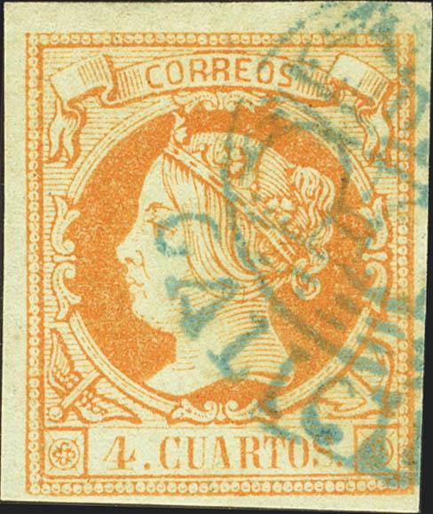52. 1860. 4 cuartos naranja. Matasello prefilatélico PUENTEAREAS / GALICIA. MAGNIFICO. Cert. CEM.