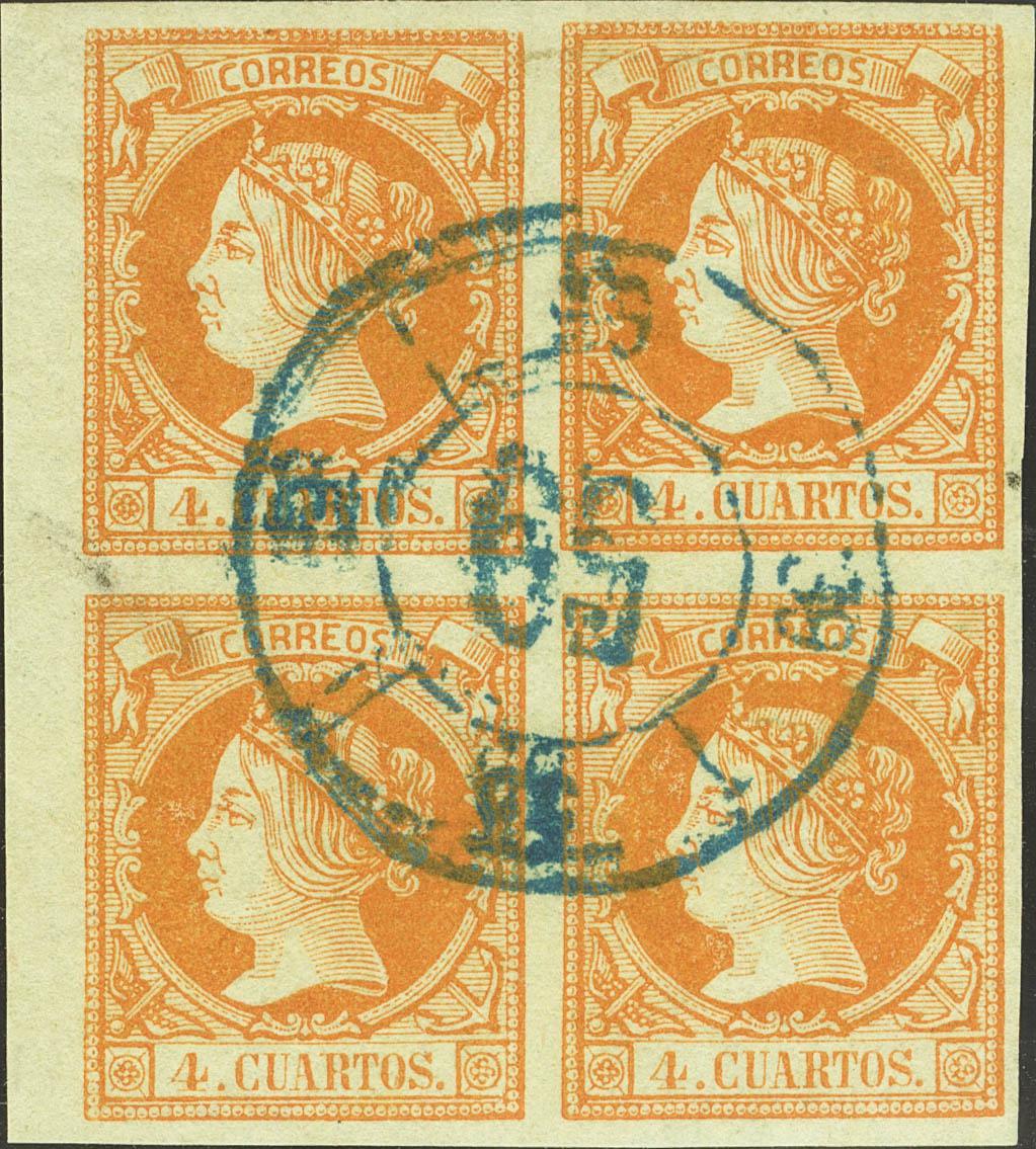 52(4). 1860. 4 cuartos naranja, bloque de cuatro, borde de hoja. Matasello R.CARRETA Nº59, en azul de Trujillo. MAGNIFICO Y MUY RARO.