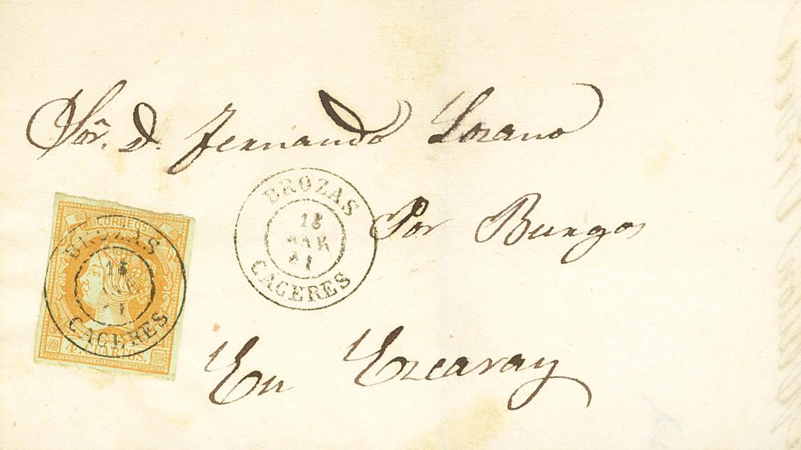 52. 1861. 4 cuartos naranja. BROZAS a EZCARAY. Matasello BROZAS / CACERES. MAGNIFICA.