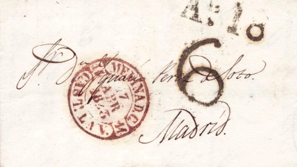 1843. MEDINA DEL CAMPO a MADRID. Baeza MEDINA D.C. / CAST.LA V. (Tipo I), en rojo. MAGNIFICA ESTAMPACION.