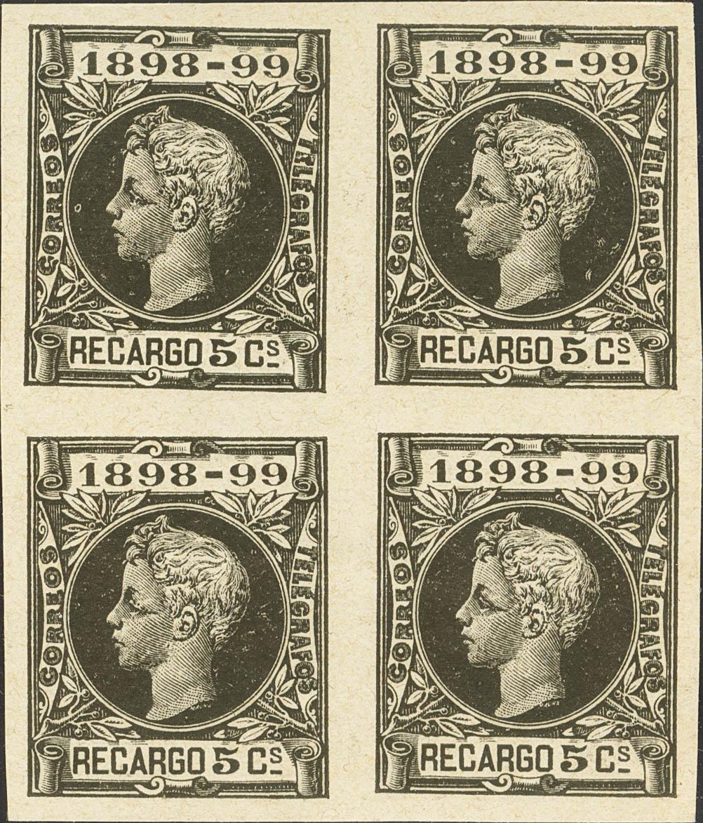 (★) 240s(4). 1898. 5 cts negro, bloque de cuatro. SIN DENTAR. MAGNIFICO Y RARO. Edifil 2023: +284 Euros