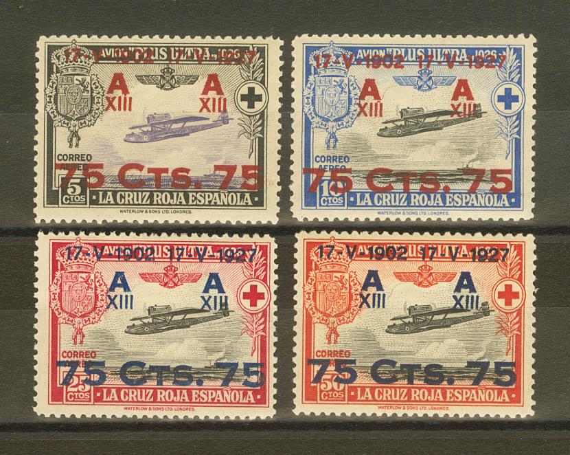 ★★ 388/91. 1927. Serie completa (75 cts sobre 25 cts rojo y negro con fijasellos). Excepcional centraje. MAGNIFICA. Edifil 2023: -275 Euros