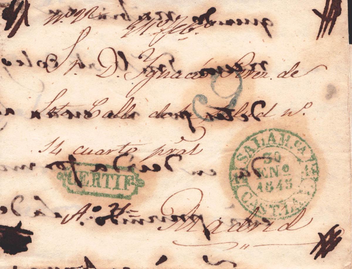 1845. Certificado (carta completa) de SALAMANCA a MADRID. Marca CERTIF (de uso general), en verde (P.E.14) edición 2004, Nº de Certificado, cruces de tinta en las esquinas, tomas de razón y "Recibí" al dorso, como era habitual en el correo certificado. MAGNIFICA Y EXTRAORDINARIAME RARA.