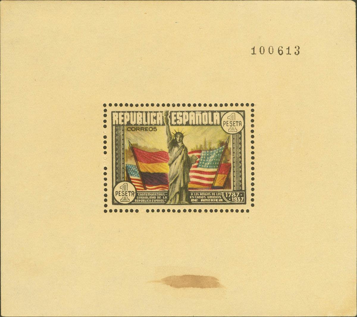 ★★ 764a. 1938. Hoja bloque (conservación habitual). FONDO AMARILLENTO. MAGNIFICA. Edifil 2020: 65 Euros