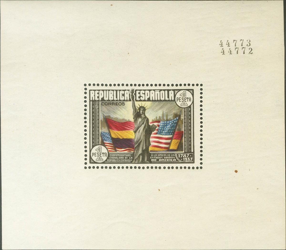 ★★ 764. 1938. Hoja bloque. NUMERACION DOBLE CORRELATIVA (no catalogada). MAGNIFICA Y RARISIMA.
