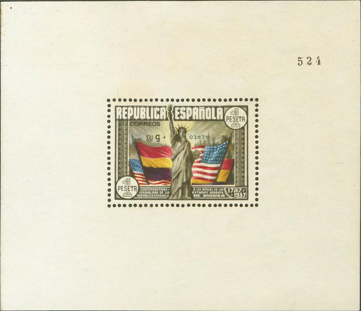 ★ 766hi. 1938. Hoja bloque. AEREO+5 PTS. SOBRECARGA INVERTIDA. MAGNIFICA Y EXTRAORDINARIAMENTE RARA, SOLO CINCUENTA HOJITAS FUERON IMPRESAS, DESDE LA Nº501 HASTA LA 550. Cert. COMEX. Edifil 2020: 8.000 Euros