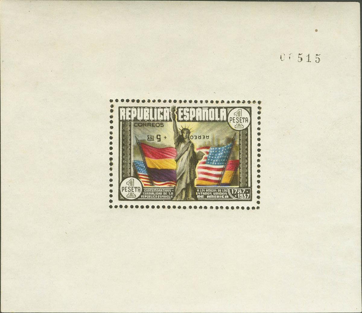 ★★ 766hi. 1938. Hoja bloque. AEREO+5 PTS. SOBRECARGA INVERTIDA (numeración privada, se trata de una hojita con sobrecarga invertida y sin numeración a la que se añadió el número con posterioridad, el catálogo hace referencia a ella y le asigna un valor de 825 Euros). MAGNIFICA.