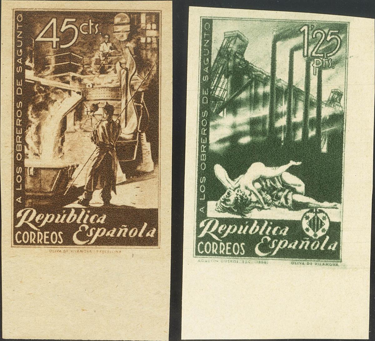 (★) 773/74ccs. 1938. 45 cts castaño y 1´25 pts verde gris. CAMBIOS DE COLOR y SIN DENTAR. MAGNIFICOS. Edifil 2020: 161 Euros