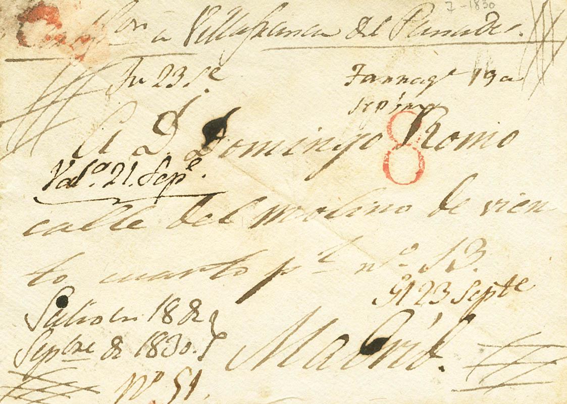 1830. Certificado (envuelta completa) de VILLAFRANCA DEL PENEDES (BARCELONA) a MADRID. Anotación manuscrita "Certificación a Villafranca del Penedés" (P.E.7, corresponde exactamente) edición 2004, cruces en las esquinas, tomas de razón y al dorso "Recibí", como es habitual en el correo certificado. MAGNIFICA Y EXTRAORDINARIAMENTE RARA, ESPECIALMENTE TRATANDOSE DE UNA ENVUELTA COMPLETA.