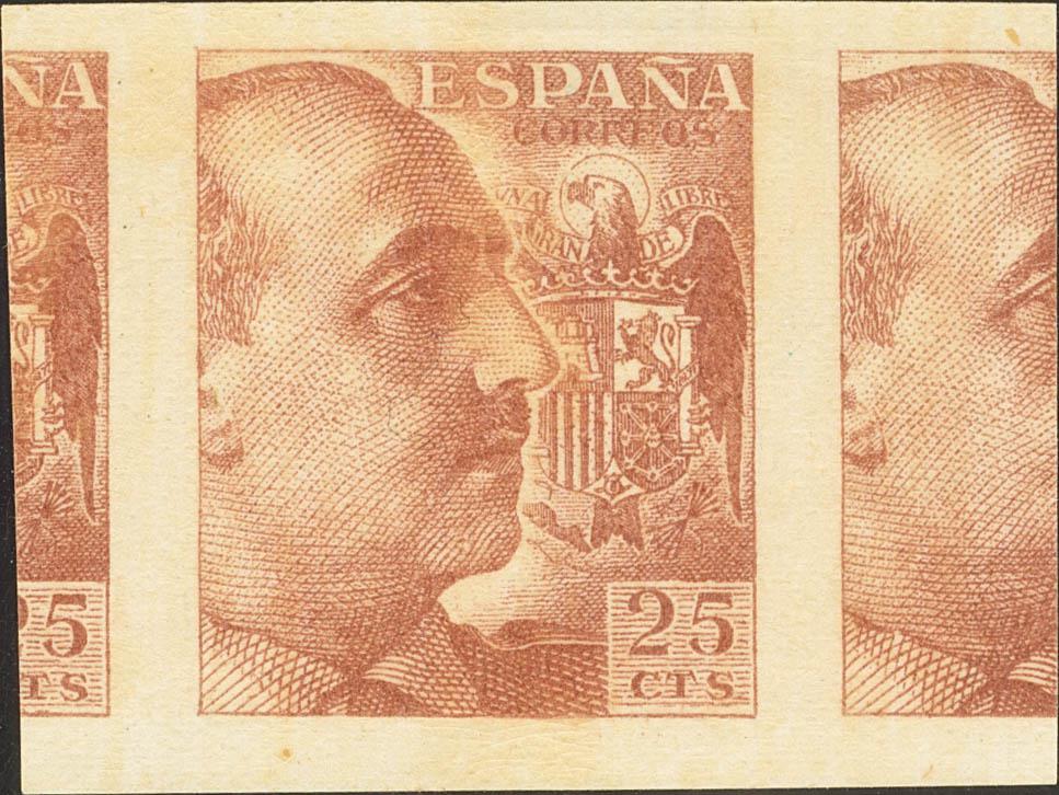 ★★ 923ccs. 1939. 25 cts castaño rojo. CAMBIO DE COLOR, SIN DENTAR e IMPRESO EN EL LADO DE LA GOMA. MAGNIFICO Y RARO.