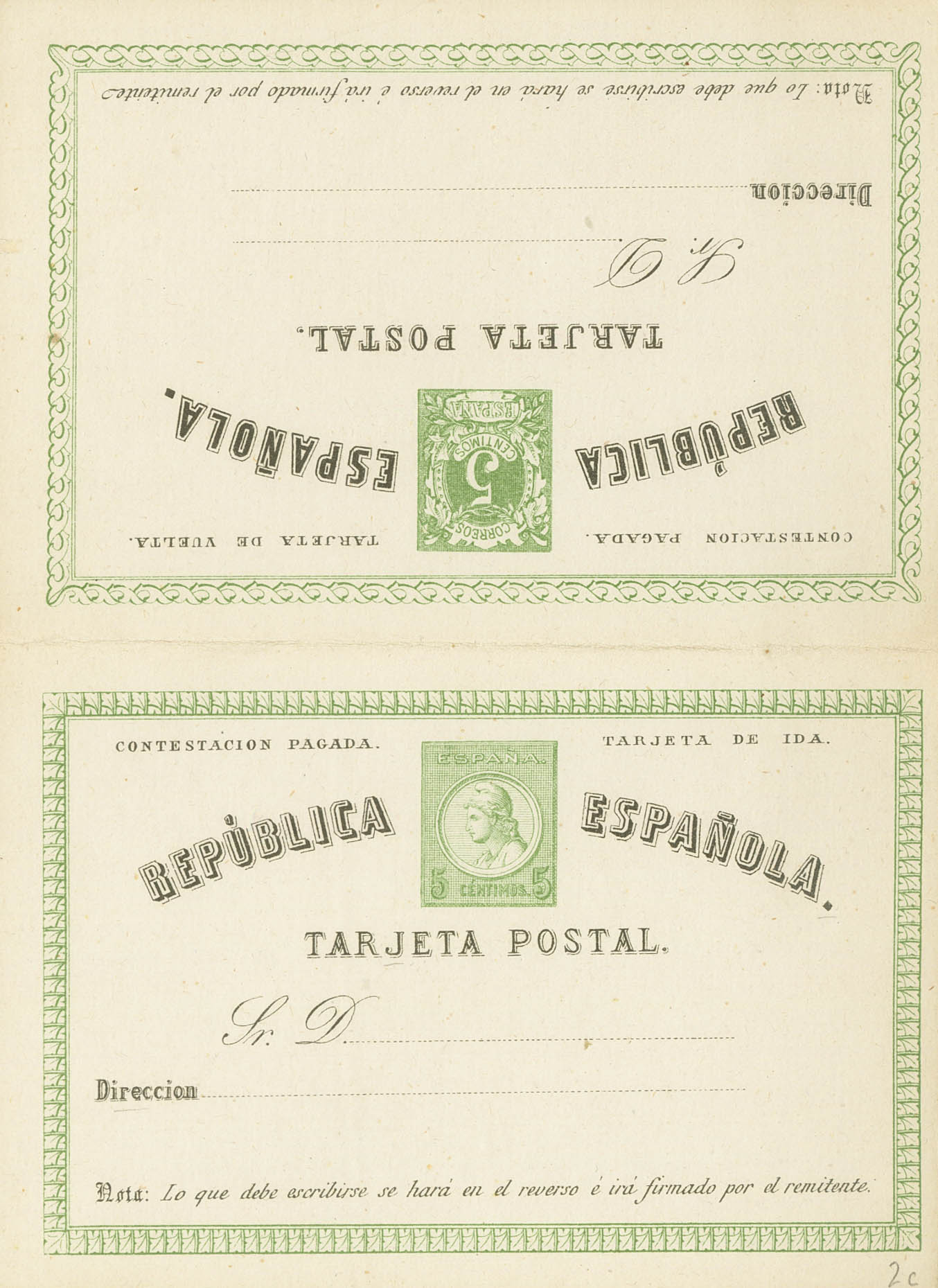 (★) EP2c. 1873. 5 cts + 5 cts verde sobre Tarjeta Entero Postal, de ida y vuelta. SIN LINEA DIVISORIA ENTRE LAS DOS TARJETAS. MAGNIFICA. Edifil 2017: 115 Euros