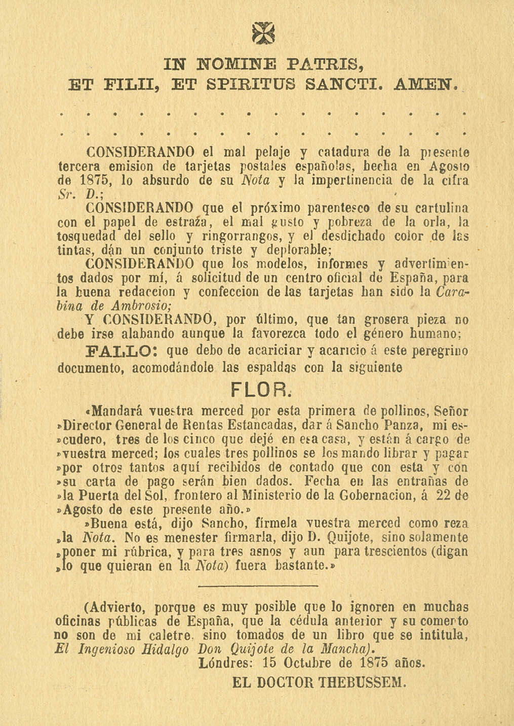 EP8ipf. 1875. 5 cts ultramar sobre Tarjeta Entero Postal con sobreimpresión privada del Doctor Thebussem "In Nomine Patris,...". BONITA Y RARISIMA. (Láiz 2006, 300 Euros)