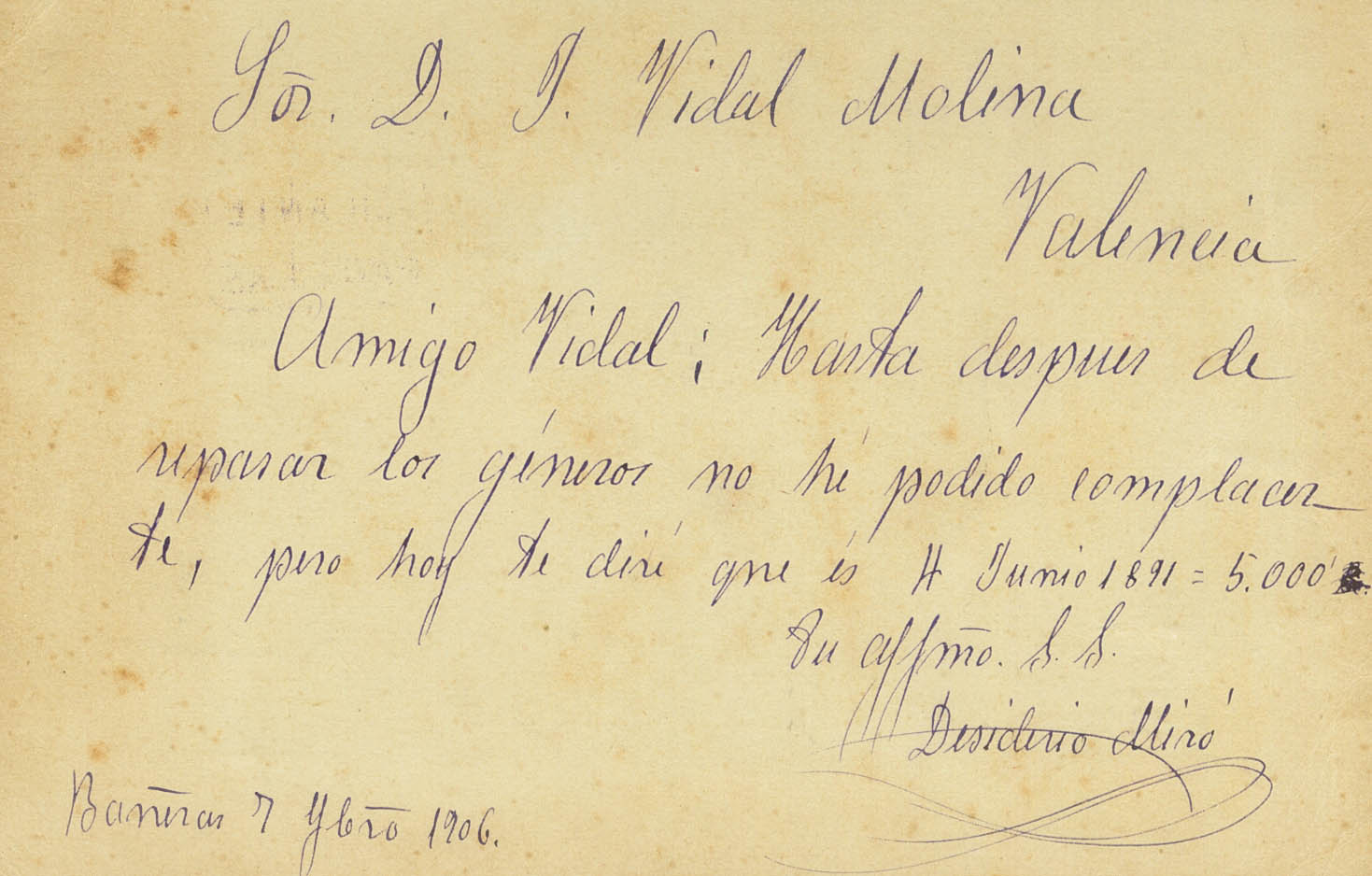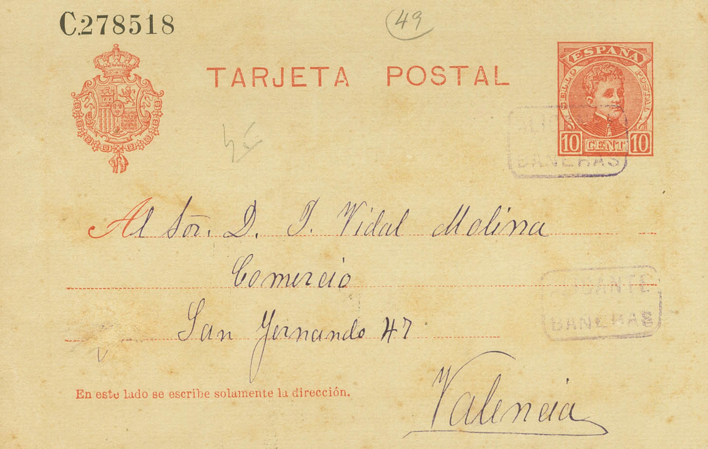 EP45. 1906. 10 cts naranja sobre Tarjeta Entero Postal de BAÑERAS a VALENCIA. Matasellos cartería ALICANTE / BAÑERAS. MAGNIFICO.