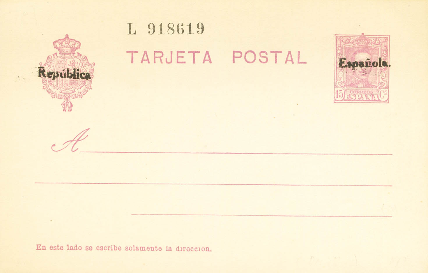 (★) EP66. 1931. 15 cts lila sobre Tarjeta Entero Postal (sobrecarga manual). MAGNIFICA. Edifil 2023: 102 Euros