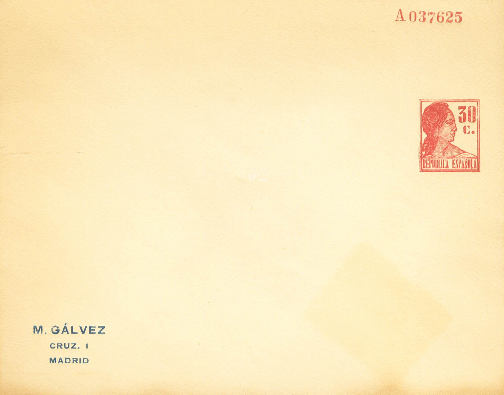 (★) EP1284. 1932. 30 cts rojo sobre Entero Postal Privado M.GALVEZ (sin correos). MAGNIFICO. (Láiz 2006, 140 Euros)