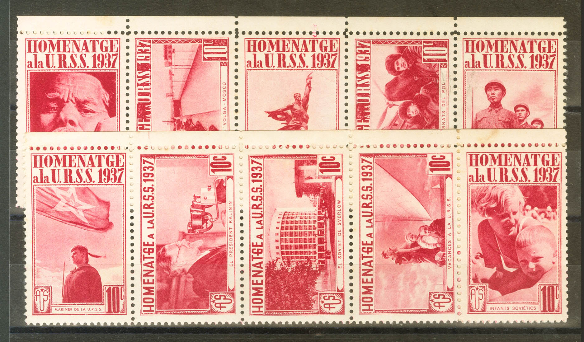 ★★1937. Serie completa, en carmín rosa, diez valores. HOMENATGE A LA U.R.S.S. MAGNIFICA. (Guillamón 1739/48D)