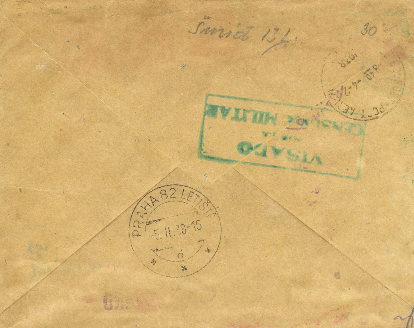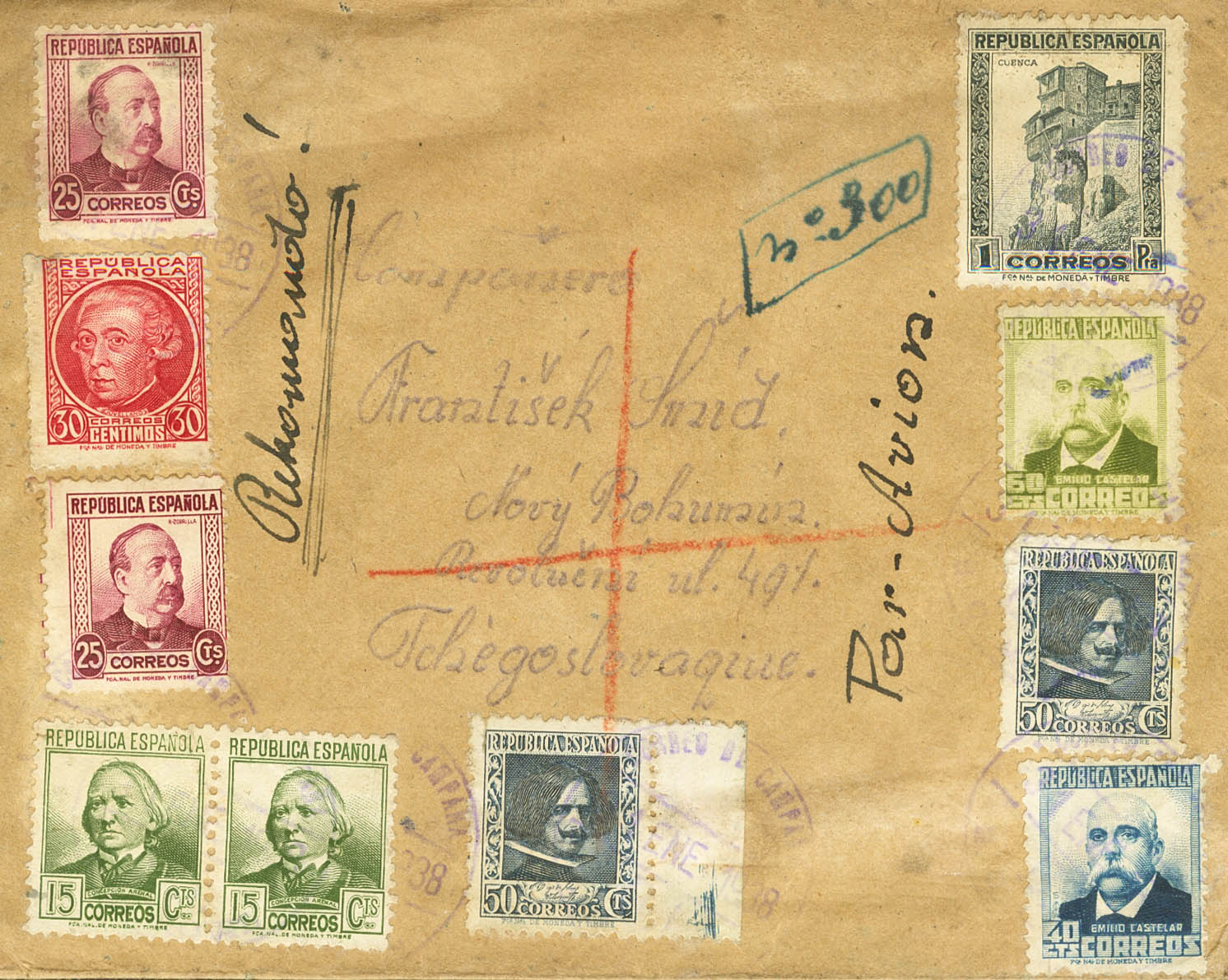 733(2),738(2),670,672/73. 1938. Diversos valores. Brigadas Internacionales Certificada dirigida a NOVY BOHUMIN (CHECOSLOVAQUIA). MAGNIFICA.