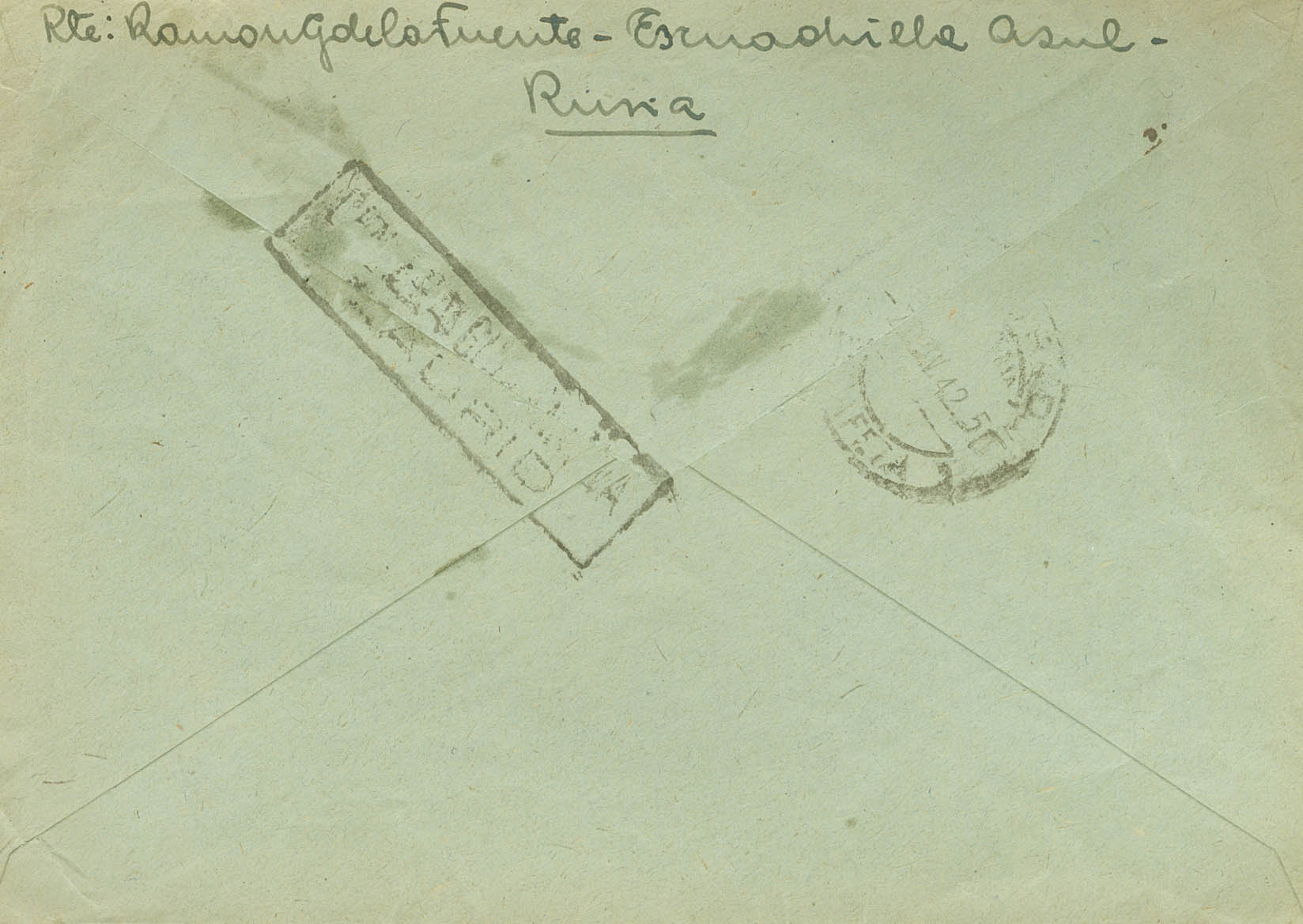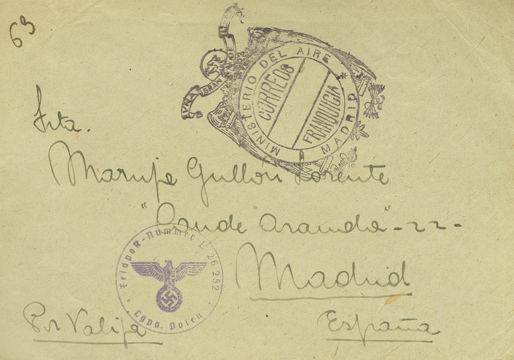 1942. ESCUADRILLA AZUL (Junio). POSEN (ALEMANIA) a MADRID, remitida por el alférez piloto Ramón G. de la Fuente, de la 2ª Escuadrilla. Marca de franquicia MINISTERIO DE AIRE / MADRID y FELDPOST-NUMMER L26252 / LGPA POSEN, en violeta y al dorso llegada. MAGNIFICA Y MUY RARA.