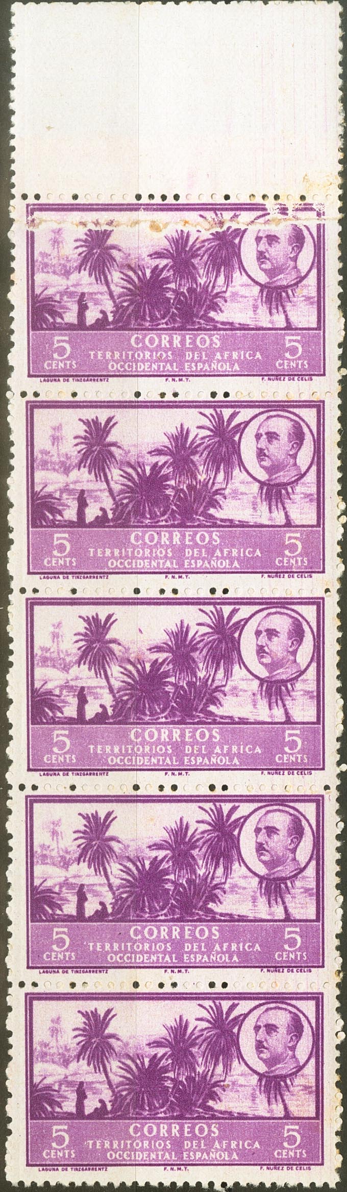 ★★ 4. 1950. 5 cts lila claro, tira vertical de cinco sellos (conservación habitual). Sello superior variedad EMPALME DEL PAPEL. MAGNIFICA Y RARA, NO RESEÑADA ESTA VARIEDAD.
