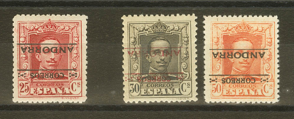 ★★/★ 6hi, 7hi, 9hi. 1928. 25 cts carmín, 30 cts castaño y 50 cts naranja. Variedad SOBRECARGA INVERTIDA. MAGNIFICOS Y RAROS. Edifil 2019: 575 Euros