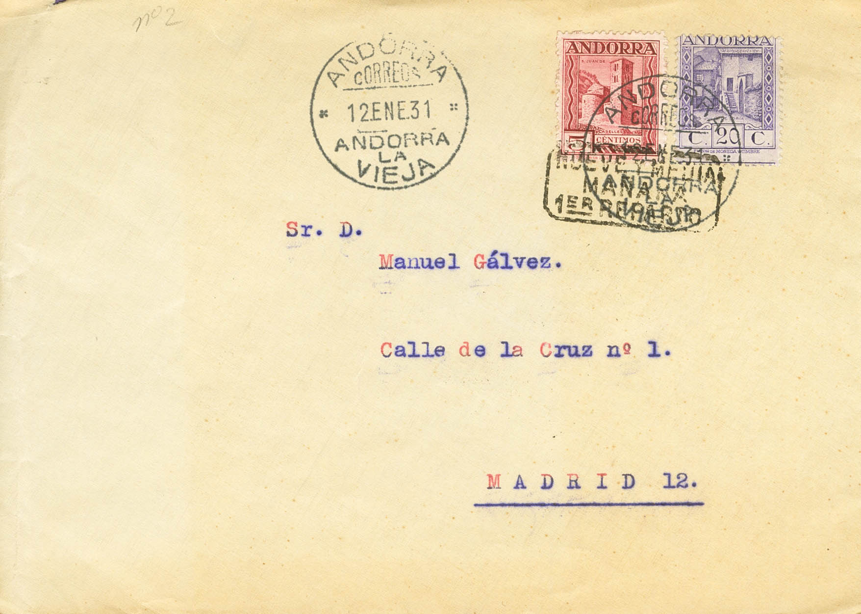 16, 19. 1931. 5 cts lila y 20 cts violeta. ANDORRA LA VIEJA a MADRID. Matasello mixto ANDORRA / ANDORRA / LA / VIEJA y NUEVE Y MEDIA / MAÑANA / 1ER REPARTO, al dorso llegada. MAGNIFICA.