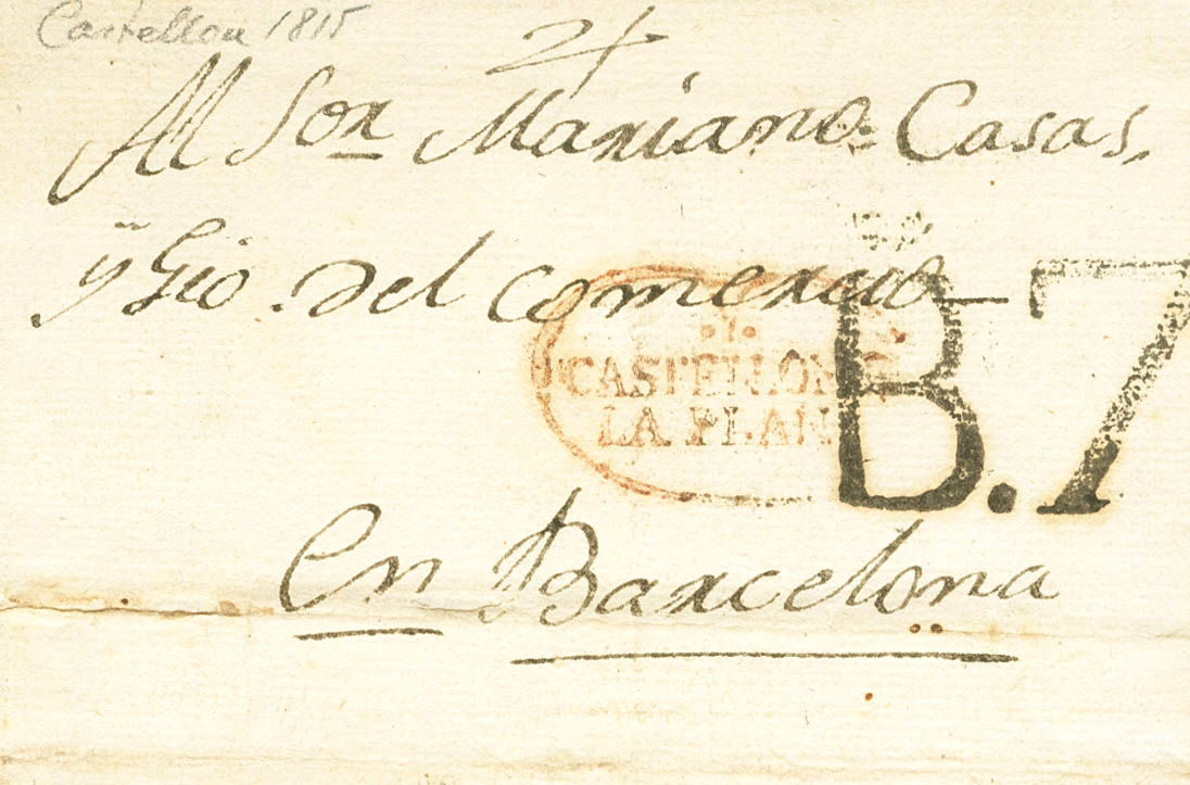 1815. CASTELLON a BARCELONA. Marca V / CASTELLON D LA PLANA (P.E.5) edición 2004. MAGNIFICA E INUSUAL.