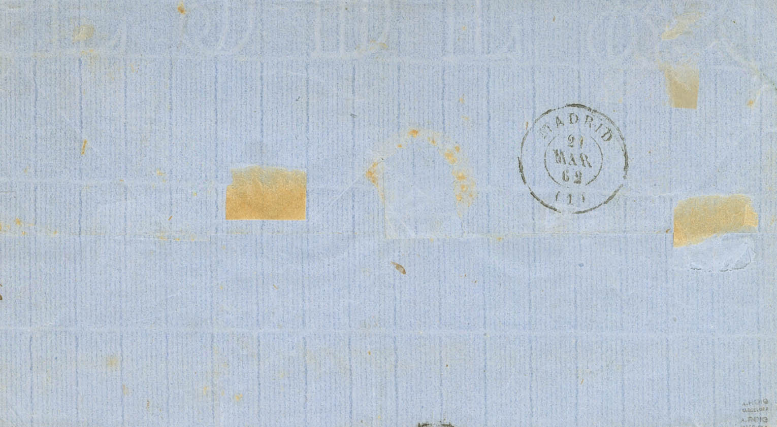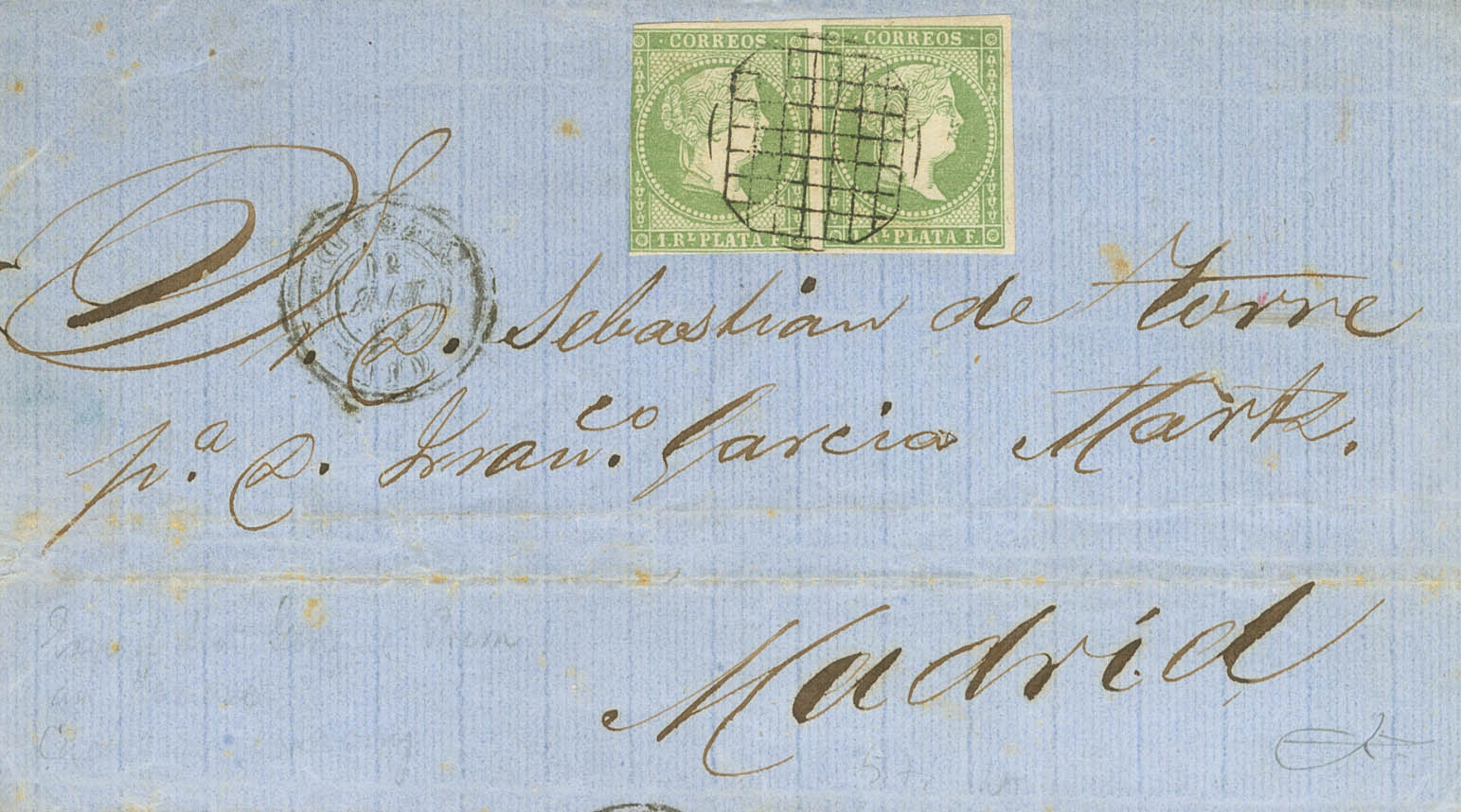 Ant.8(2). 1862. 1 real verde de Antillas, pareja. VERACRUZ (MEXICO) a MADRID, circulada por el correo Español. Matasello PARRILLA DE VERACRUZ, utilizado durante el periodo del Ejército Expedicionario Español en México. MAGNIFICA Y EXTRAORDINARIAMENTE RARA, SOLO SE CONOCEN TRES CARTAS CON ESTE MATASELLO UTILIZADAS DURANTE ESTE PERIODO. Ex-Luis Alemany. Cert. COMEX.