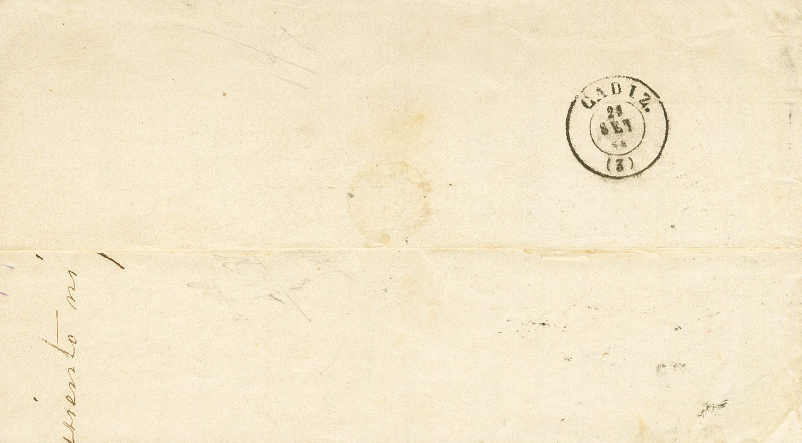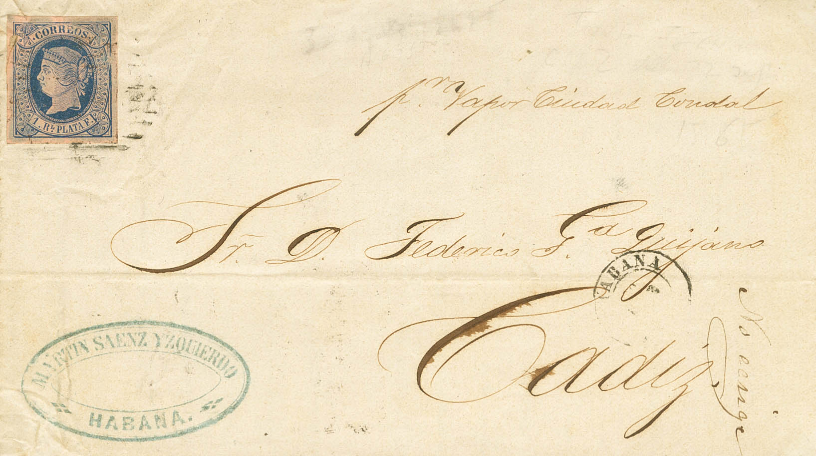 Ant.11. 1865. 1 real azul sobre salmón de Antillas. LA HABANA a CADIZ. En el frente anotación manuscrita "Por Vapor Ciudad Condal" de la Compañía de Vapores de Antonio López y Cía. MAGNIFICA.