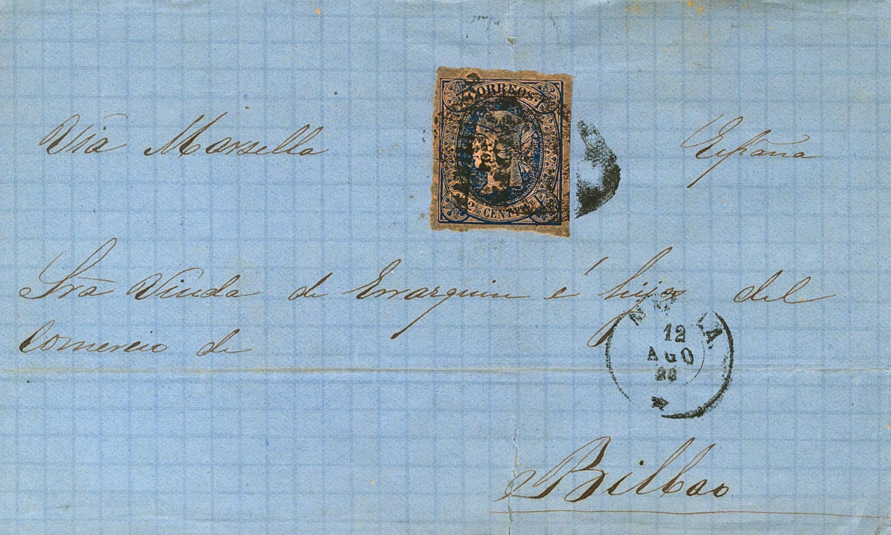 20O. 1869. 12 4/8 cts azul HABILITADO / POR LA / NACION. MANILA a BILBAO. MAGNIFICA Y RARA.