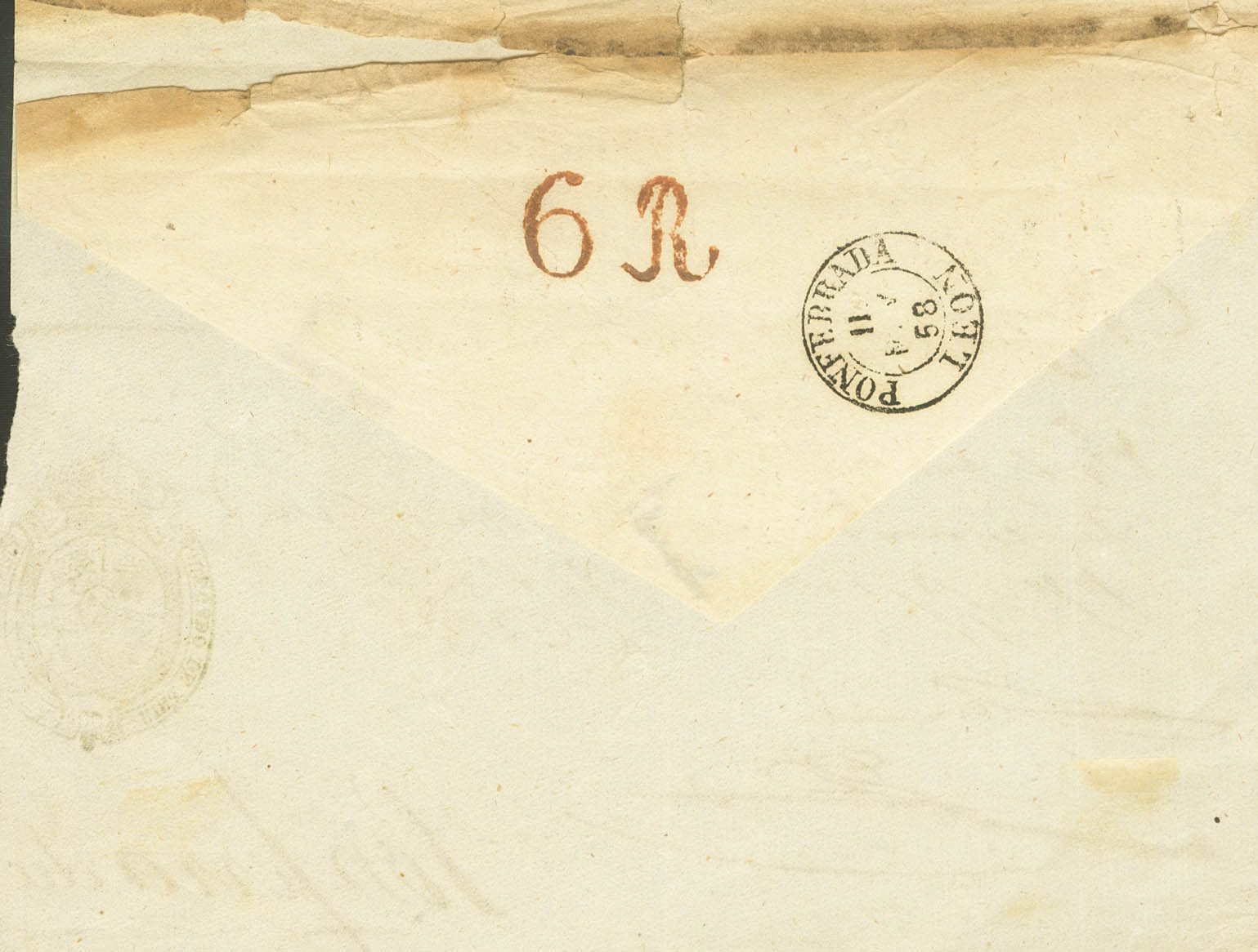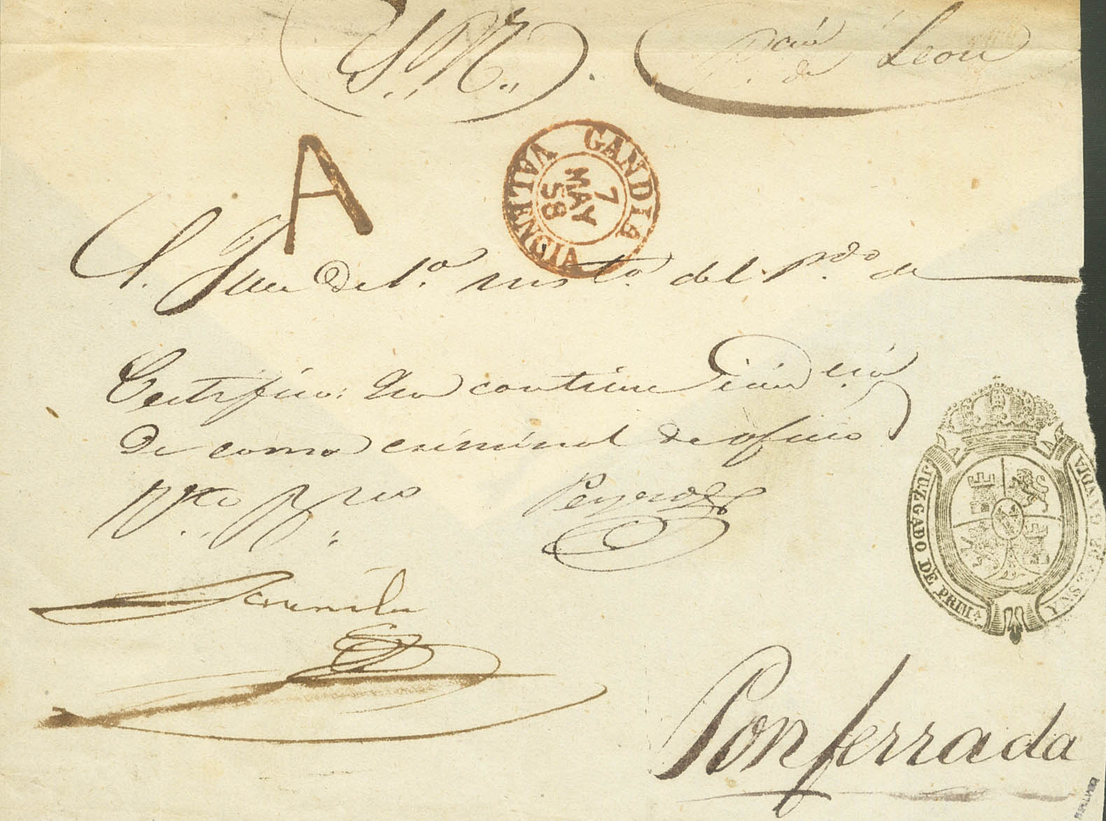 1858. Frente de Plica Judicial (con una solapa trasera con llegada) de GANDIA (VALENCIA) a PONFERRADA (LEON). Marca de abono "A", en rojo de Gandía (P.E.11) edición 2004. MAGNIFICA Y MUY RARA.