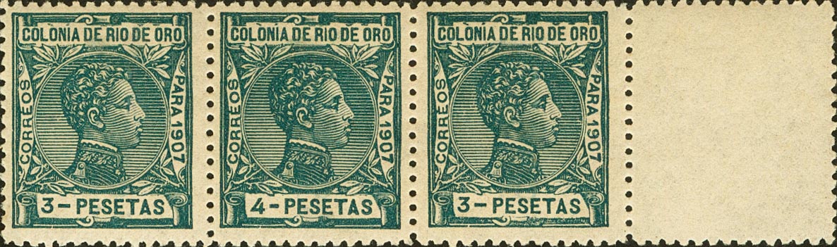★★ 30(2), 31ec. 1907. 3 pts verde, dos sellos y 4 pts verde ERROR DE COLOR, unidos en tira de tres. MAGNIFICA Y MUY RARA. Cert. GRAUS. Edifil 2018: +825 Euros